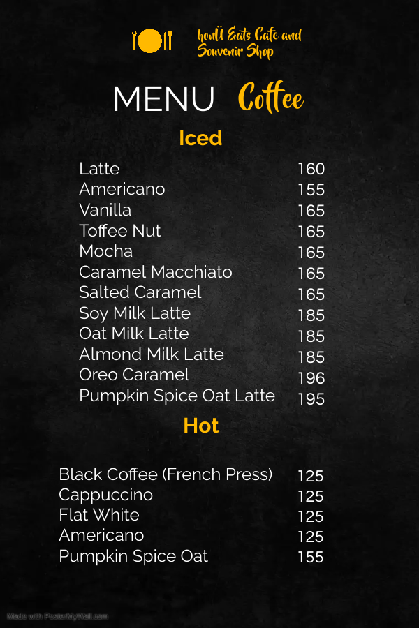 The menu at Honü Eats Cafe offers a variety of options primarily centered around coffee and light meals suitable for breakfast, coffee breaks, and casual dining. Visitors will find a selection of specialty coffee drinks including classics like Flat White and Coffee Latte, along with seasonal options such as Pumpkin Spice Oat Latte. The cafe also features baked goods, with cookies highlighted as a notable offering.