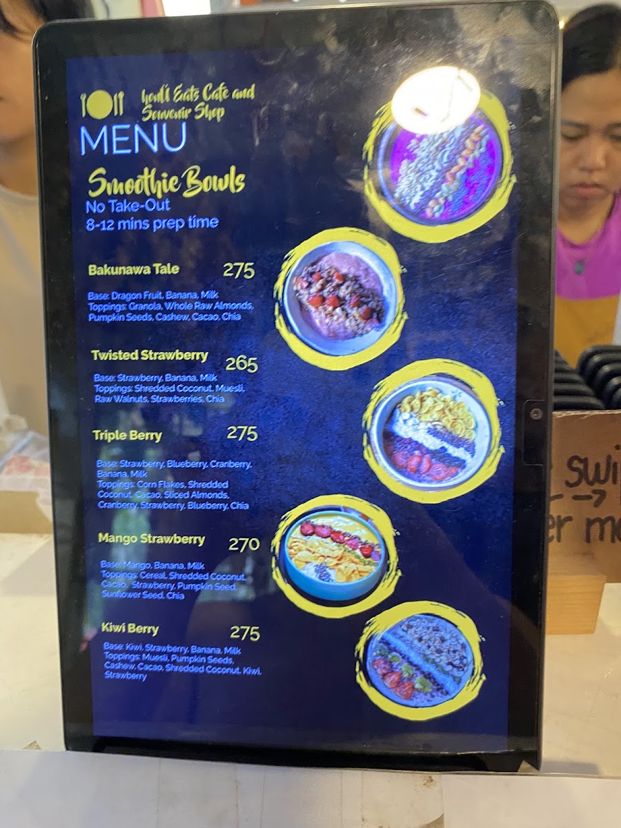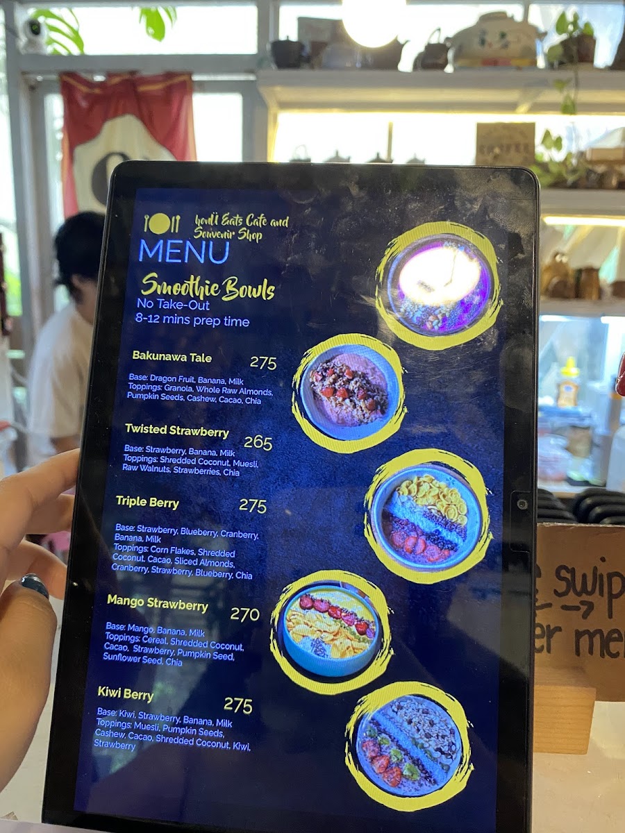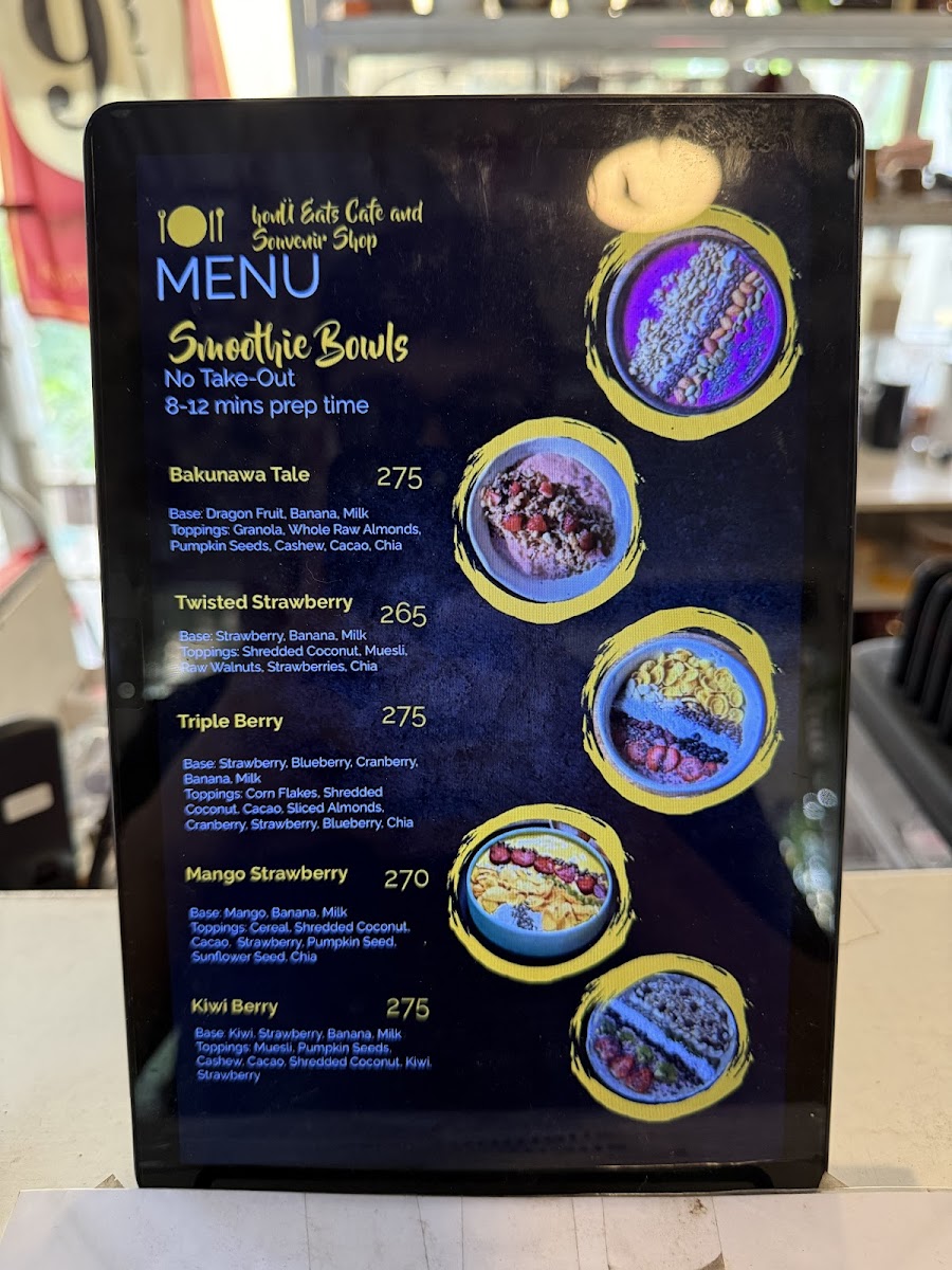 Food choices include light meals and smoothie bowls, which provide a balance of ingredients and textures. These items are appropriate for those seeking a snack or a light meal to accompany their beverage. The menu is designed to accommodate quick orders or relaxed dining experiences.